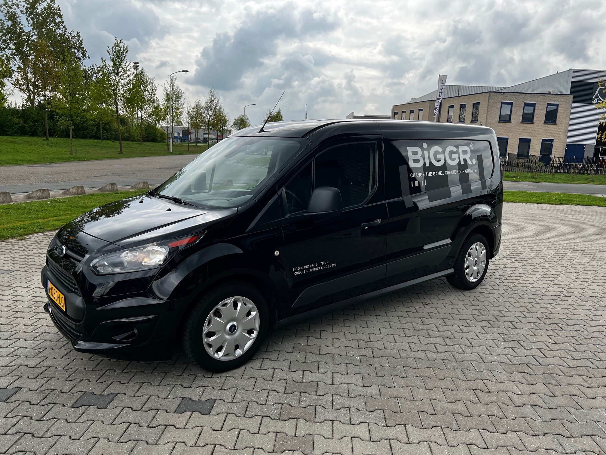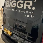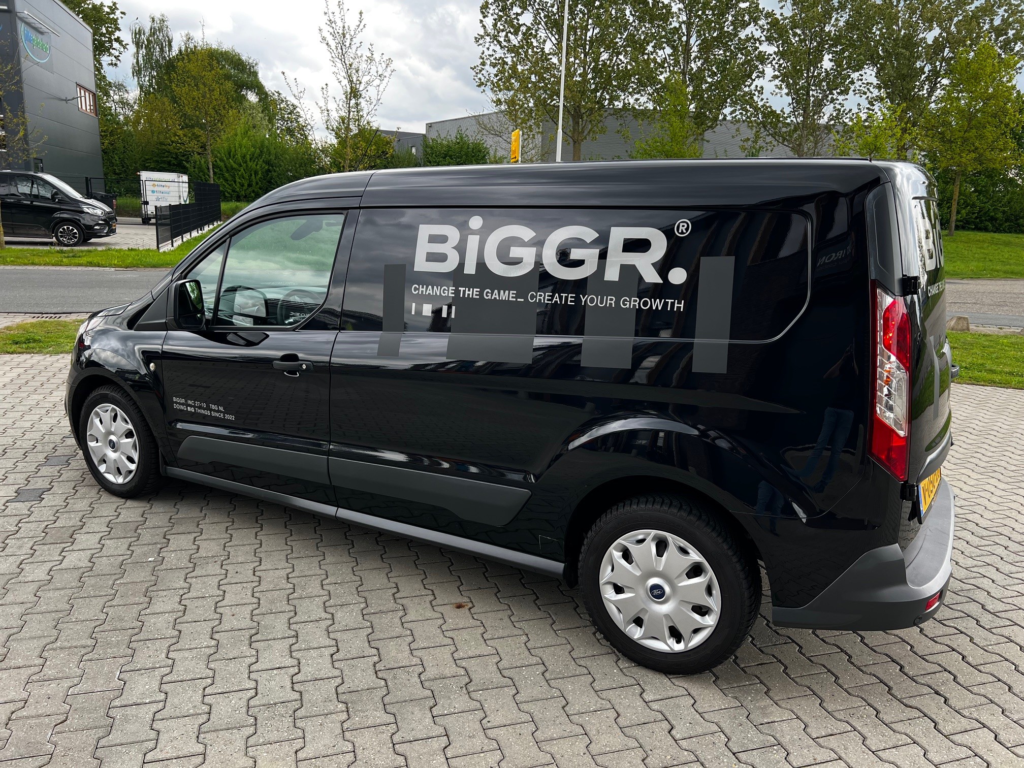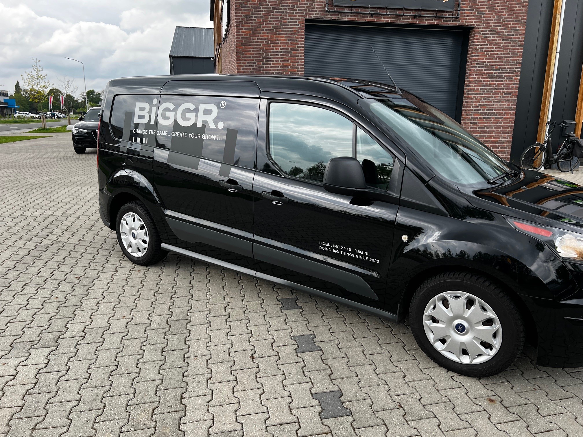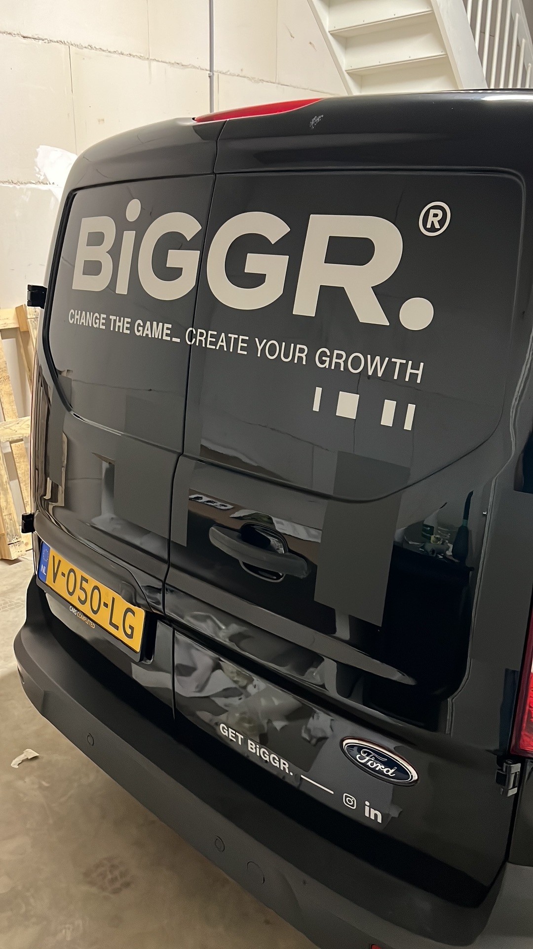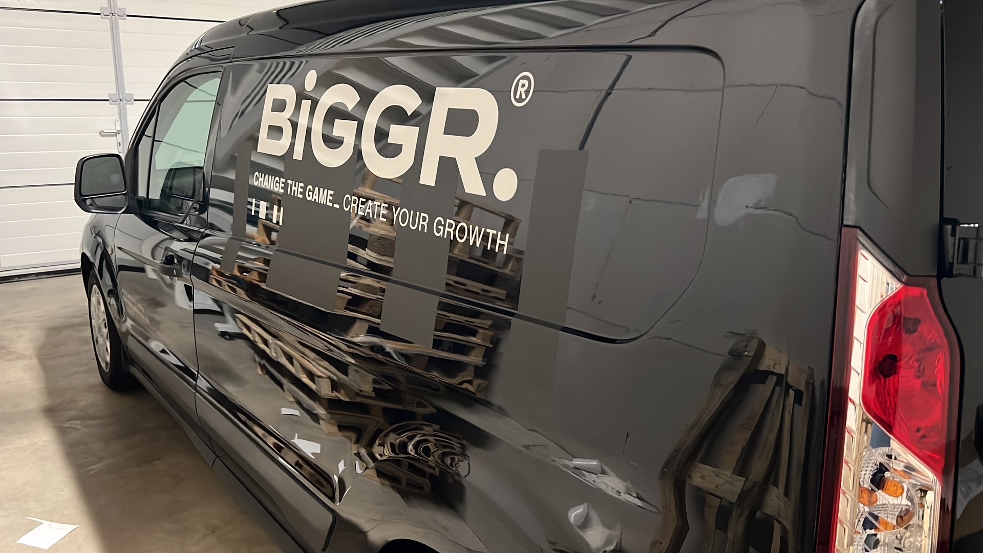 Voor BiGGR. verzorgden we de autobelettering met een combinatie van matte en glanzende folies. Door het contrast in afwerkingen springt de subtiele branding toch direct in het oog.
