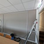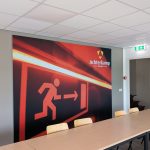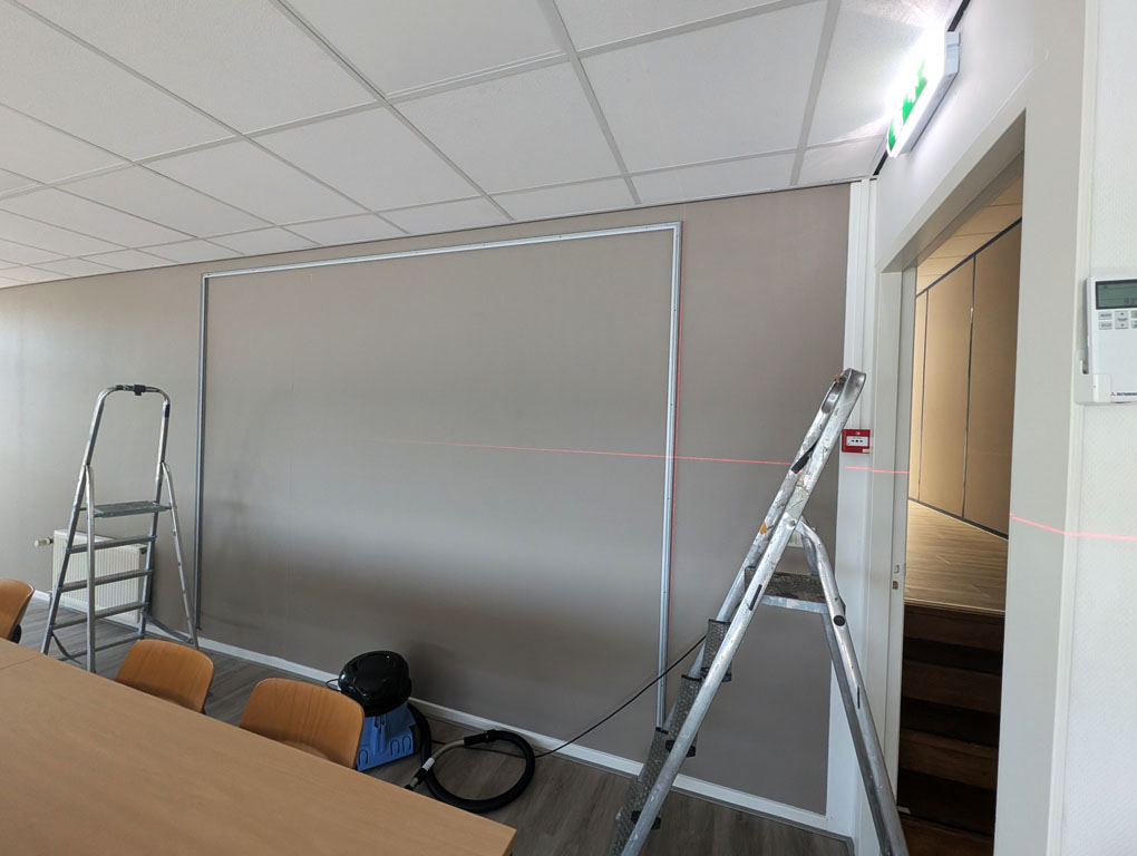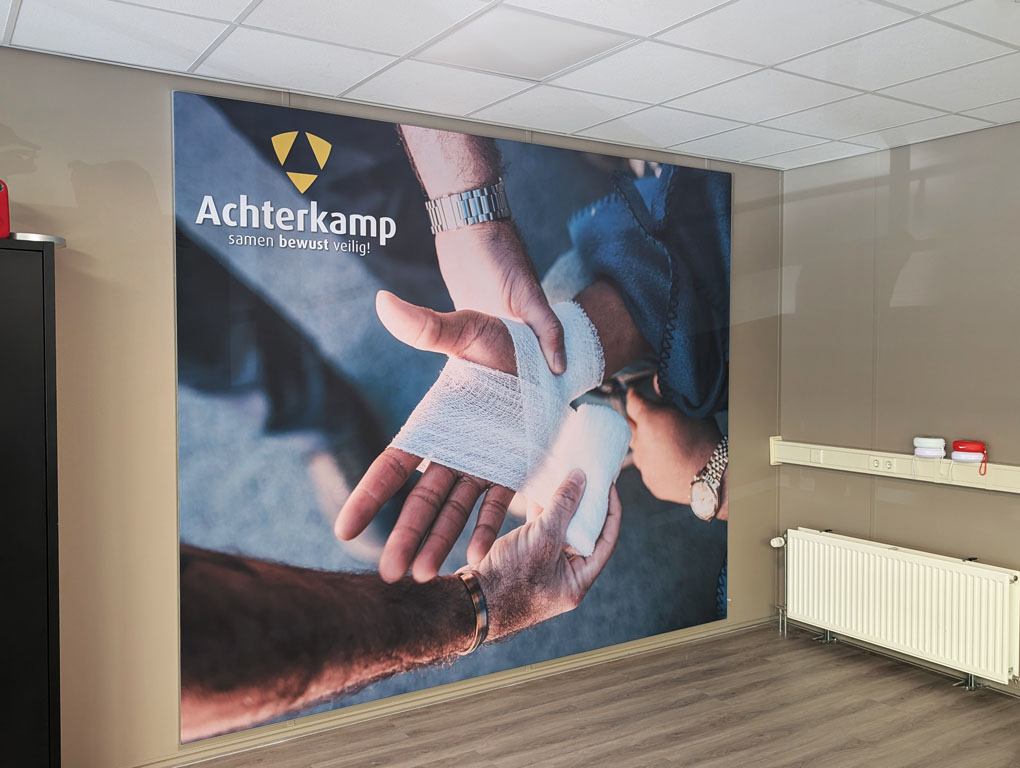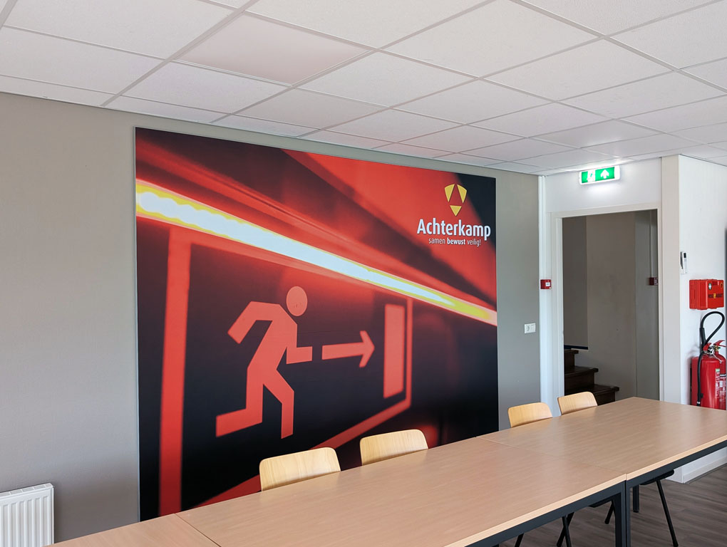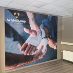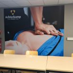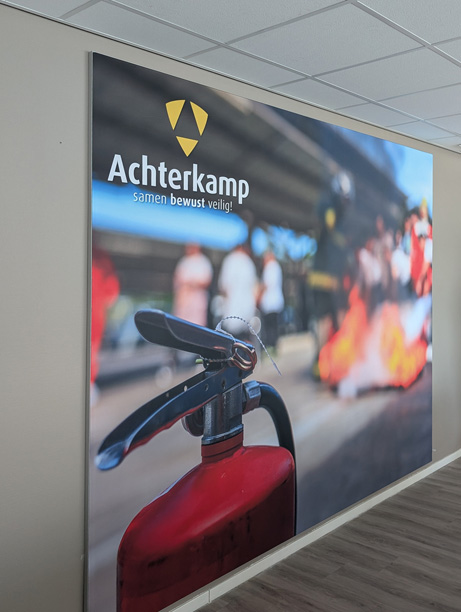 Voor Achterkamp Bedrijfsopleidingen in Baak hebben we de leslokalen voorzien van een textieldoek in frame. De doeken geven een goed beeld weer van de activiteiten die Achterkamp verzorgt. In het voortraject hebben we verschillende opties naast elkaar gelegd waarbij uiteindelijk gekozen is voor een peesdoek in frame. De doeken hebben een formaat van 230/250 cm hoog en 300 cm breed. De beelden zijn van hoge resolutie wat ervoor zorgt dat deze nog steeds haarscherp zijn ondanks het grote formaat. Voordeel van een peesdoek is dat je het op termijn eenvoudig kunt wisselen.