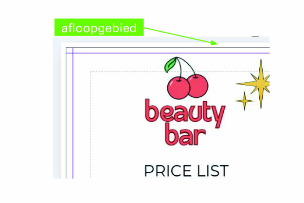 Afloop is de snijmarge dat een printbedrijf of drukkerij nodig heeft om een document te kunnen snijden zonder dat je witte randjes krijgt aan je drukwerk. Om de afloop zichtbaar te maken doe je het volgende: Ga naar Bestand, klik op Instellingen en vink Afloop afdrukken tonen aan. Nu zie je rondom de documentlijn een witte rand dat de afloop van je document aangeeft.